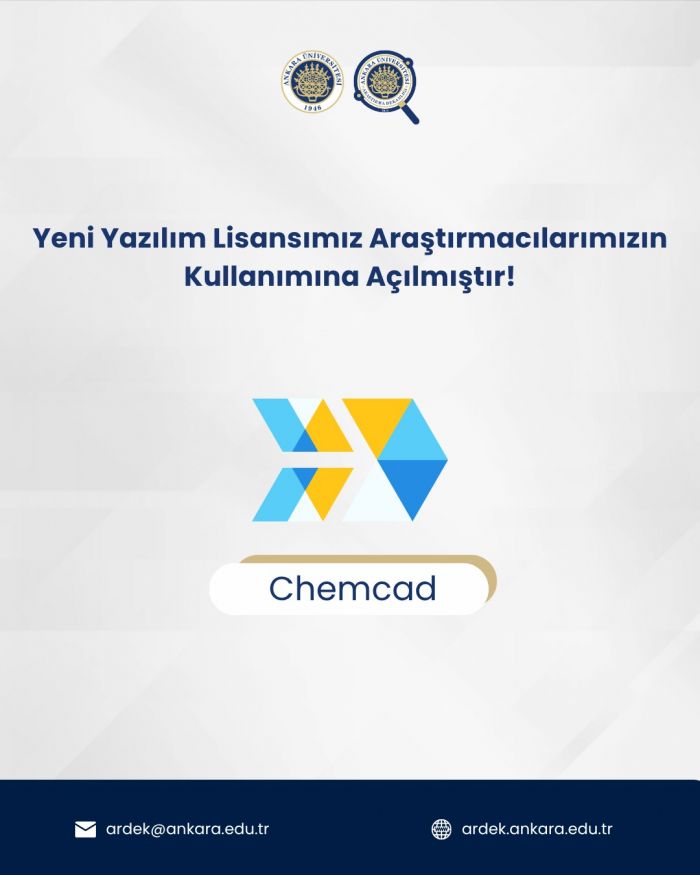 Dekanlığımızın araştırma destek çalışmaları kapsamında kullanıma sunulan ChemCAD yazılımından faydalanmak isteyen araştırmacılarımız, https://aulisans.ankara.edu.tr/ adresini ziyaret edebilirler. Kampüs dışı erişim sağlamak [...]