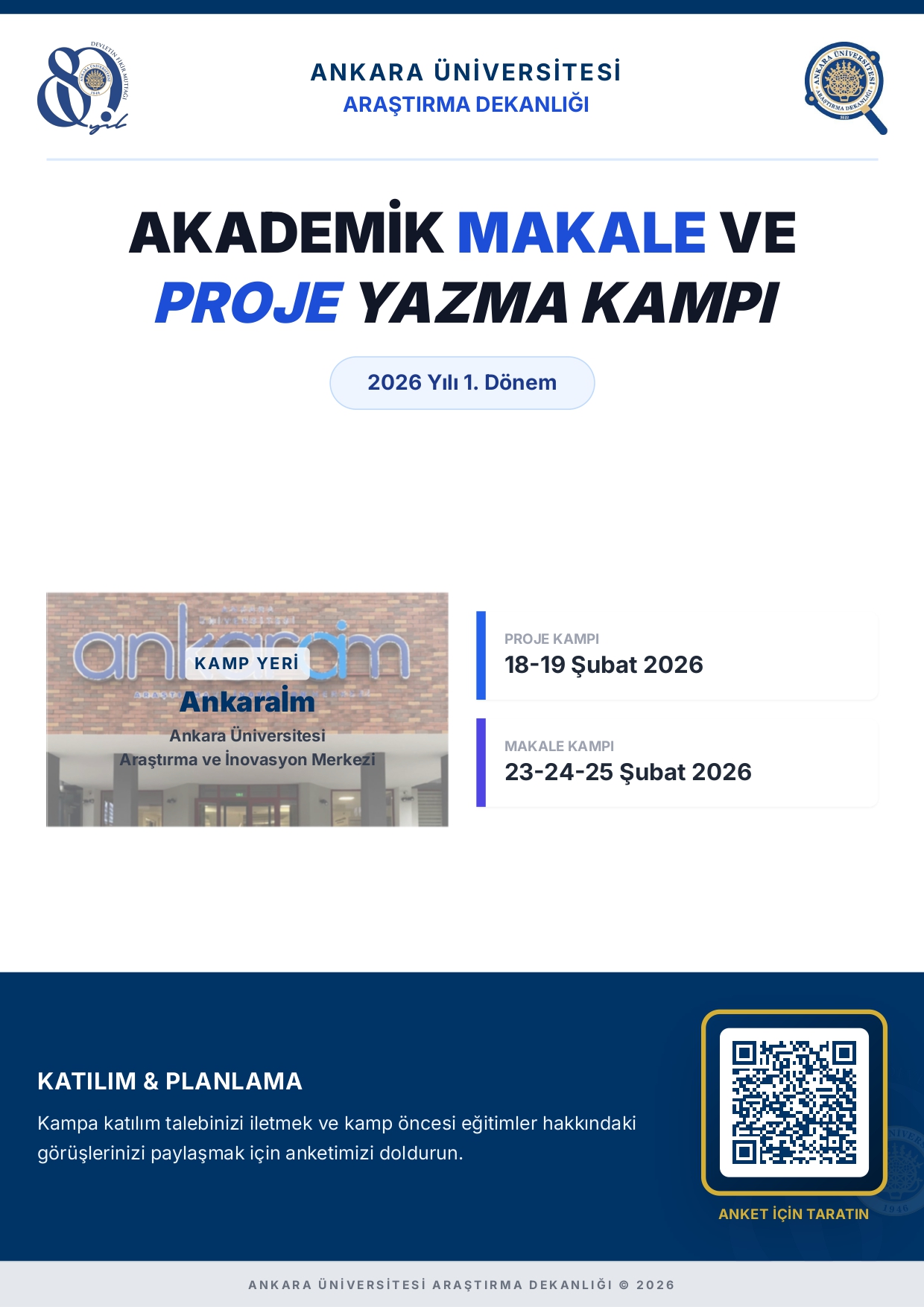 Üniversitemizin bilimsel araştırma kapasitesini geliştirmek ve öğretim elemanlarımızın akademik yayın performansını desteklemek amacıyla, Araştırma Dekanlığımız tarafından iki aşamalı bir eğitim programı planlanmıştır. Bu kapsamda, dış destekli proje geliştirme süreçlerine odaklanan “Proje Yazım Kampı” 18-19 Şubat 2026 tarihlerinde, yüksek etki faktörlü dergilerde yayın yapma stratejilerini kapsayan “Akademik Makale Yazım Kampı” ise 23-24-25 Şubat 2026 tarihlerinde gerçekleştirilecektir. Söz konusu eğitimler, Üniversitemiz 10. Yıl Yerleşkesi içerisinde bulunan Ankara Üniversitesi Araştırma ve İnovasyon Merkezi (ANKARAİM) binasında düzenlenecektir. Kamp öncesinde planlanan eğitim içeriğinin, katılımcıların akademik ihtiyaç ve beklentileri doğrultusunda en verimli şekilde yapılandırılması ve katılımcı listesinin netleştirilmesi amacıyla hazırlanan “Katılım Talebi ve İhtiyaç Belirleme Anketi”nin, araştırmacılarımız [...]